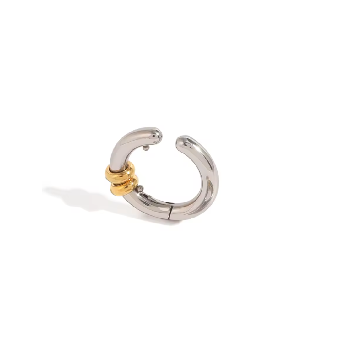 Bold but minimal. This adjustable ear cuff features a smooth stainless-steel band accented with warm 18k gold-plated rings, giving you that curated-ear look without the commitment